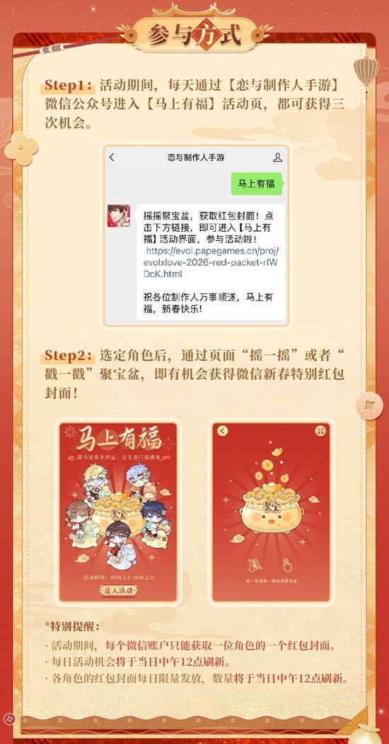 活动期间,通过【恋与制作人手游】微信公众号进入【马上有福】活动页,即可参与。