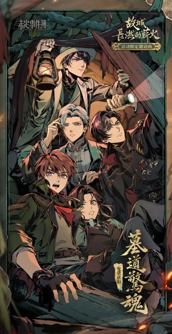 参与「故城长燃的薪火」大型新春活动,即可免费领取夏彦R思绪【凶焰】、左然R思绪【烈烽】、莫弈R思绪【燎原】、陆景和R思绪【炫火】、活动徽章【时和岁丰】及邀请函【墓道惊魂】