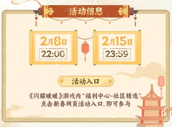活动时间:2月8日22:00-2月15日23:59,参与方式:游戏内【福利中心-社区精选】点击新春网页活动入口。