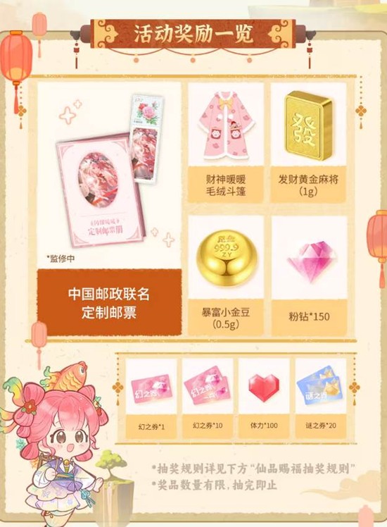 实物大奖:有机会抽取中国邮政联名邮票、财神暖暖毛绒斗篷、黄金麻将等。