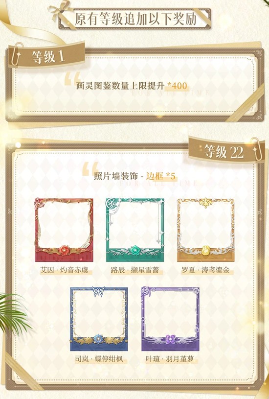 ► 原有部分等级分别追加:画灵图鉴数量上限提升、照片墙装饰。