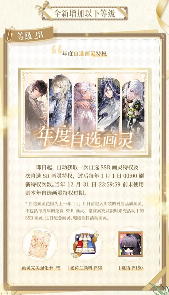 ► 全新等级28级可得:年度自选画灵特权、[画灵完美强化卡]、[老荷兰颜料]等奖励。