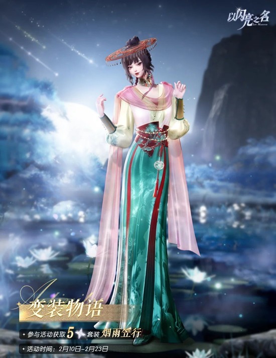 以闪亮之名变装物语-烟渚篇活动即将开启, 明日可获取五星限定套装~累积变装物语积分,可以获取限定五星套装【烟雨笠行】、拍照萌拍【元气农场】、拍照相框【云中梦境】、钻石*100及多种材料道具奖励!一起来和小编看看吧~