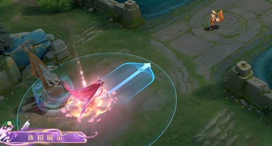 云缨神骥越千峰以西南丝绸之路上的蜀道为灵感,提取翼马纹、太阳纹及蜀葵、蜀锦等风物元素打造视觉语言。技能特效中普通攻击枪舞流光蜀葵飞散,一技能神骥扬蹄踏花,二技能蓄力步步生花,三技能驭神骥冲刺开出山间通途。