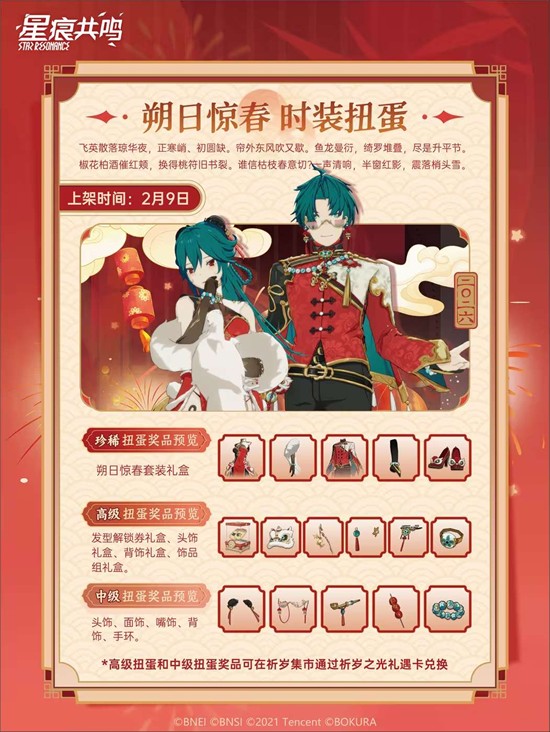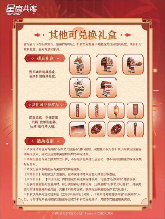 本次扭蛋中获得的所有奖励均为绑定道具。「珍稀扭蛋」内的限定外观道具,在本次活动结束后暂无其他获取途径。「高级扭蛋」、「中级扭蛋」内的限定外观道具除抽取外,可通过「祈岁集市」兑换获取。