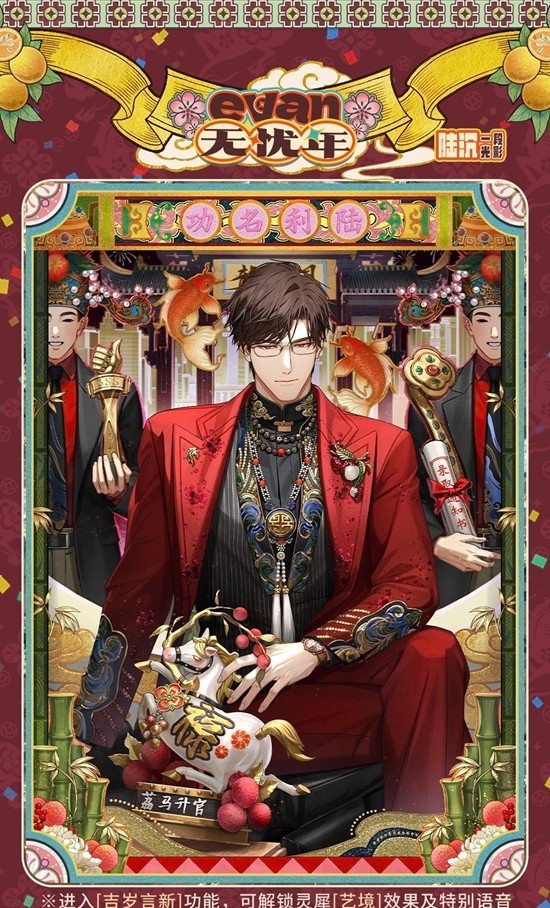 [6星]灵犀 陆沉・无忧年 一段含[艺境]效果。进入[吉岁言新]功能,可解锁灵犀[艺境]效果及特别语音。