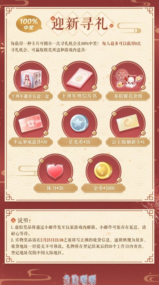 每获得一种卡片可拥有一次寻礼机会且100%中奖! 每人最多可以获得9次寻礼机会,可赢取精美周边和游戏内道具~