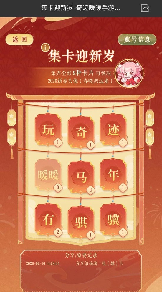 集齐全部9种卡片可在【集卡迎新岁】界面领取2026新年头像【春暖鸿运来】。