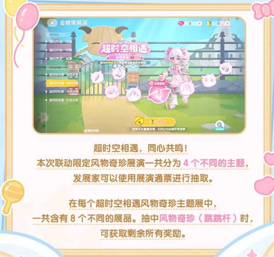 本次联动活动以"超时空相遇"为主题,展演时间从2月14日持续至3月16日05:59。发展家可使用展演通票参与抽取,将有机会获得各类联动限定奖励。