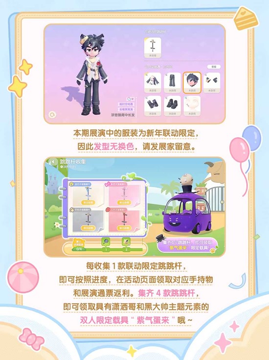 发展家收集指定数量的限定载具后,将可以获得联动限定手持物平底锅玩具、展演通票以及联动限定双人载具"紫气蛋来"。这些充满童趣的联动道具将为小镇生活增添更多欢乐氛围。