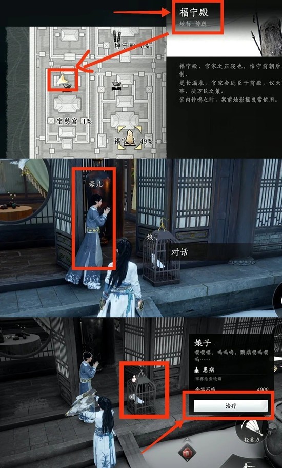 ①第一把,先跟蓉儿对话,再治疗鹦鹉娘子。