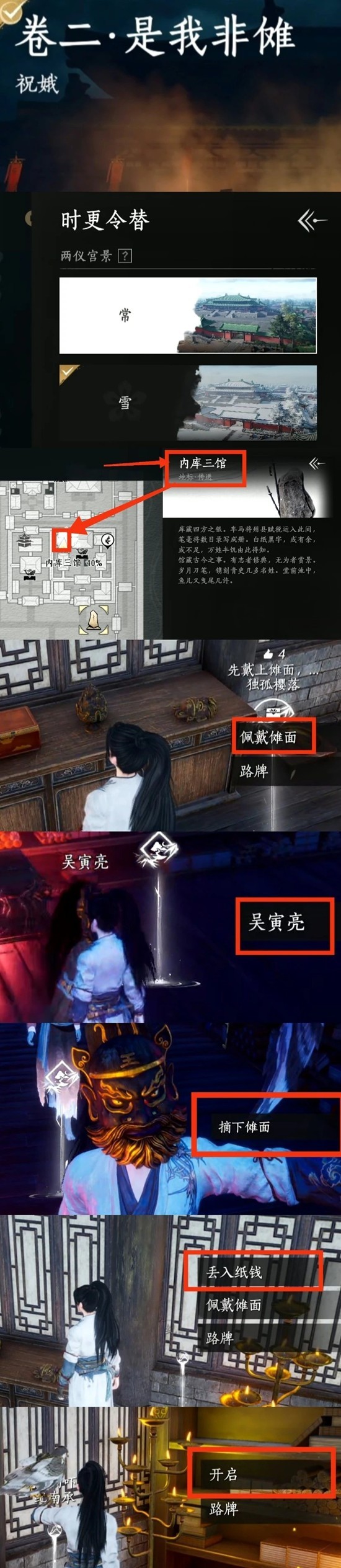 ⑩第十把,完成卷二,时间调到雪季,佩戴傩面,与灵魂对话,摘掉傩面,丢纸钱,开宝箱。进门对曲传音进行摄星拿月。