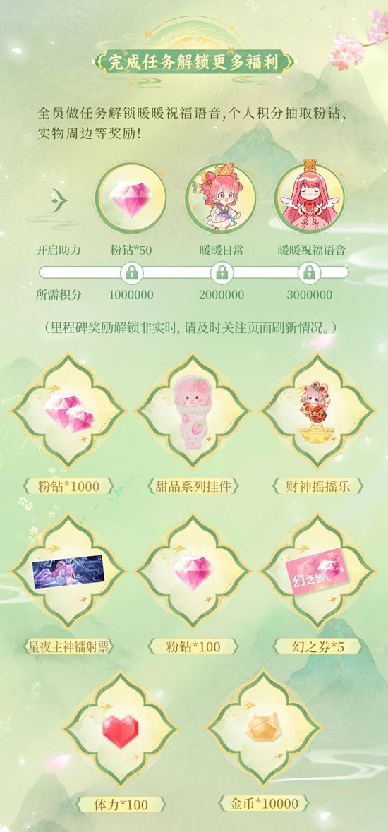 完成任务助力解锁【粉钻*50、暖暖祝福语音】等里程碑奖励!还有机会抽取粉钻*1000以及限量实物周边等!