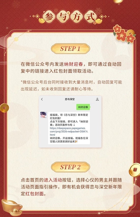 前往《恋与深空》官方公众号,发送「纳财迎春」(不含括号),即可通过自动回复中的链接进入红包封面领取活动。