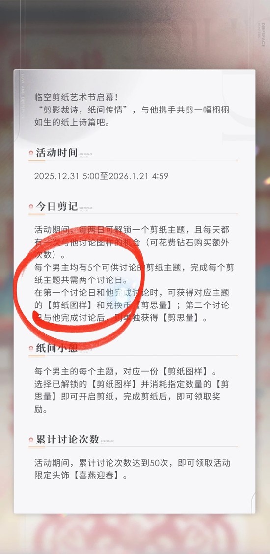 每日和每位男主能讨论一次(补次数需要50钻),讨论后获得50剪刀/次。