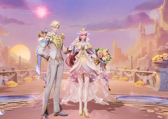 官方为这对皮肤写下了浪漫的文案:当落日的余晖,为圣洁的婚纱镀上金边,童话中的婚礼即将书写新的序章。