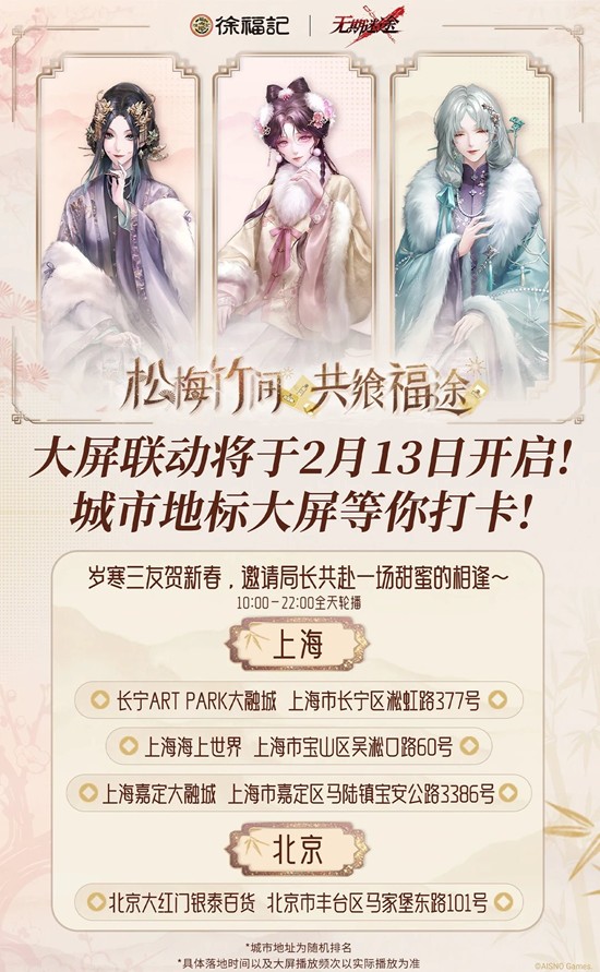 无期迷途x徐福记线下打卡活动大屏今日已正式开启~2月13日-2月15日,松梅竹间,共飨福途。诚邀局长赴一场新春之约,愿与局长同在松风梅影、竹韵清音间,共行此程。一起来和小编看看吧~