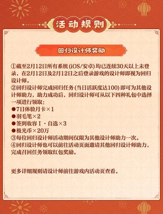 ①截至2月12日所有系统(iOS/安卓)均已连续30天以上未登录,在2月12日及2月12日之后登录游戏的设计师即视为回归设计师。