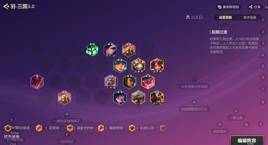 阵容组成八个三国拼上新春使者和德莱文锤石即可(这版本不需要开赵信了尽量去开格温,在野怪环节拼五个羁绊去解锁)