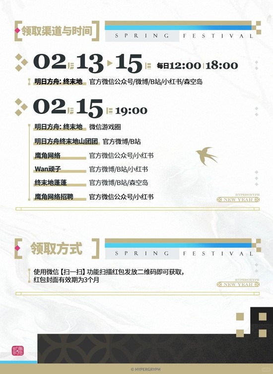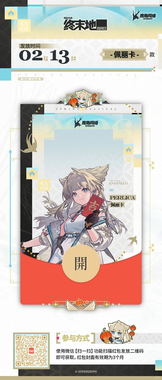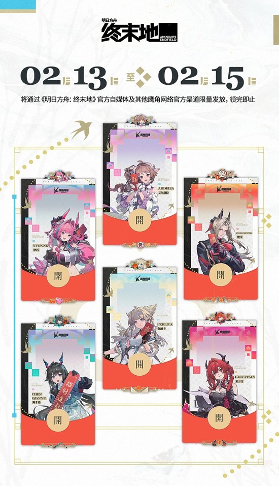 2月13日~2月15日期间,将会在《明日方舟:终末地》官方自媒体限量发放不同定制款微信红包封面(每款100000份),领完即止,敬请留意。