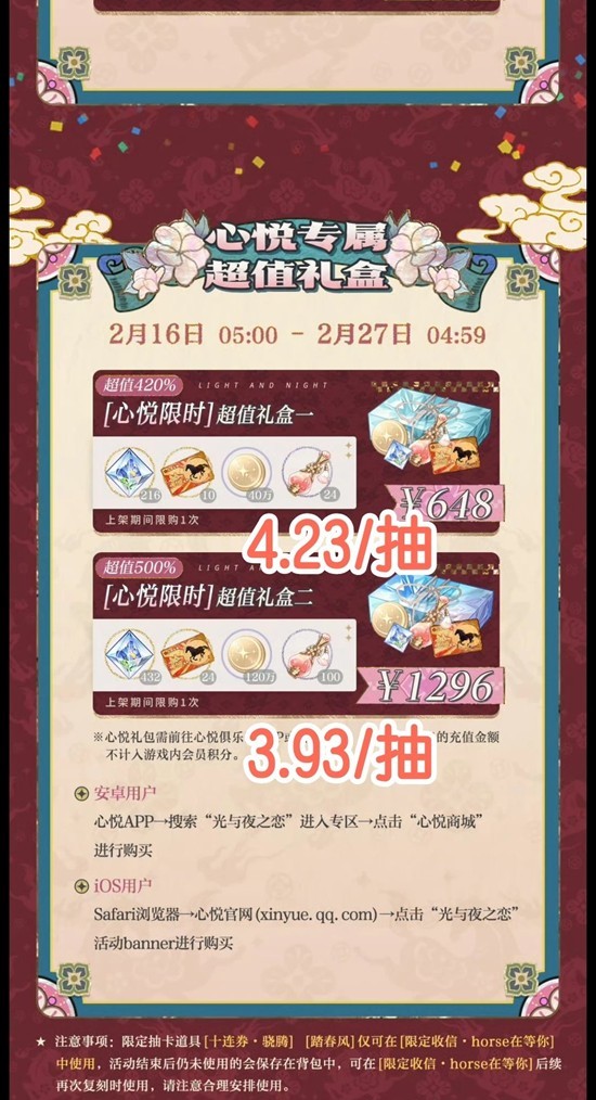 光与夜之恋新春限定收信「horse 在等你」为五位男主专属六星灵犀混池,中式红装造型,动态效果与专属剧情拉满。卡池概率 UP,结束后不进入常驻。活动可免费领取大量抽卡道具,100 抽可自选男主,那么这一卡池怎么氪金呢?小编为你准备了一份攻略,一起来看看吧~