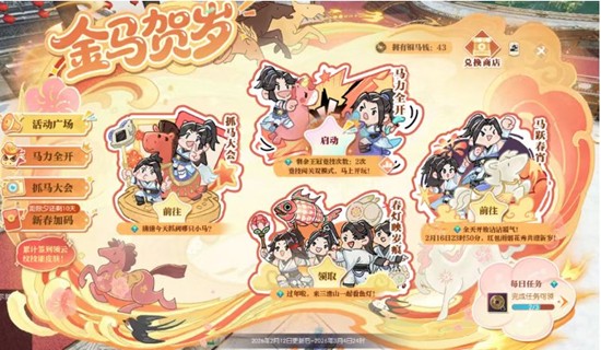 1、 春节活动金马贺岁正式开启,等级≥40级的同门可参与活动!
