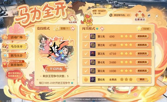 活动奖励:每局奖根据积分排名发放对应铜马钱奖励;王冠争夺时间:每日18-23时开启王冠争夺,每日上线可增加3次竞技次数(支持累计),竞技时间内匹配可自动消耗次数,获得第1名可获得王冠1顶。王冠排行:3月5日12时将根据王冠数量进行奖励结算,排行榜名列前茅的玩家可以获得限定头像框【马力全开】。