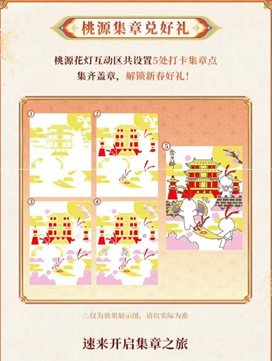 桃源花灯互动区共设置5处打卡集章点集齐盖章,解锁新春好礼!