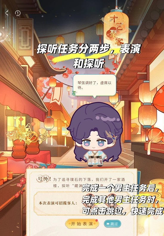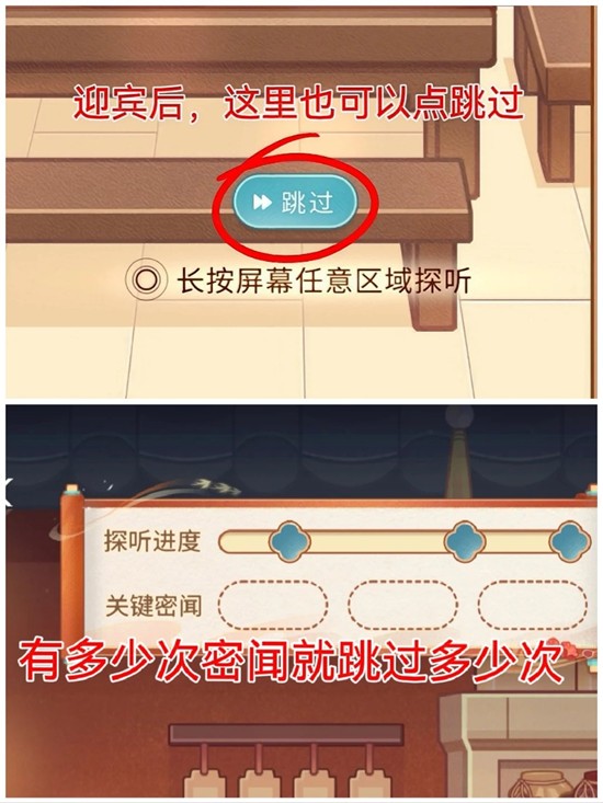 「聚客探听」这个小游戏是可以跳过的,〔跳过〕键位在图片上都有标注。
