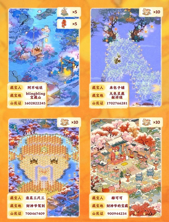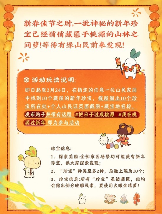即日起至2月24日,在指定的任意一位山民家园中找到10个藏匿的新年珍宝,截图圈出10个珍宝所在处+个人山民证页面截图+藏宝地名称,发布帖子并带有话题 #把日子过成桃源 #我在桃源过新年 即为成功参与活动