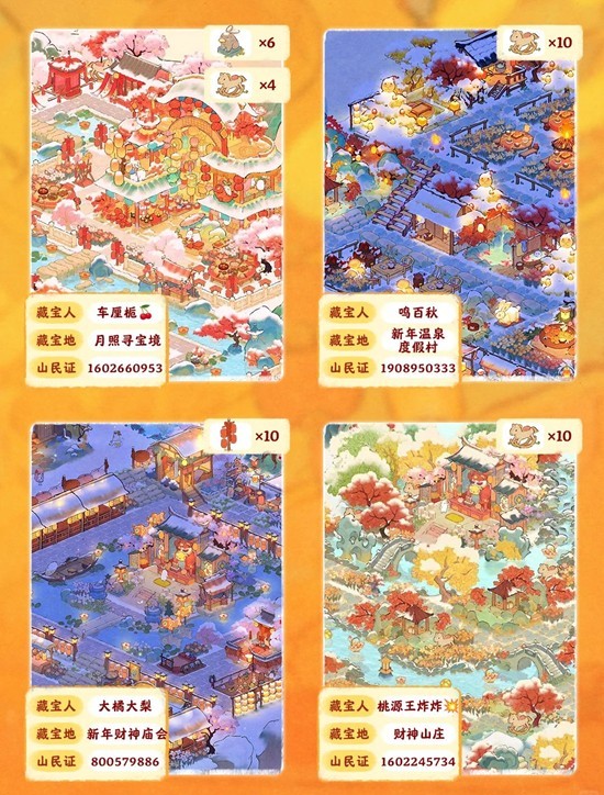 桃源深处有人家团建活动:寻宝启事新年版活动开启~即日起至2月24日,在指定的任意一位山民家园中找到10个藏匿的新年珍宝,截图圈出10个珍宝所在处+个人山民证页面截图+藏宝地名称,活动结束后,将在全部符合要求的动态中抽取3位山民送出随机周边奖励!一起来和小编看看吧~
