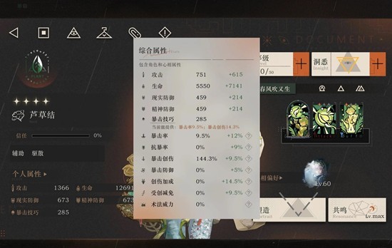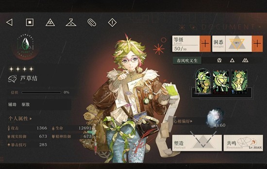共鸣调频如果草是6星可以用恍然惊诧有很多很好的生命提升。可惜草是4星所以我们选择提升生命和双防的纵情狂想。