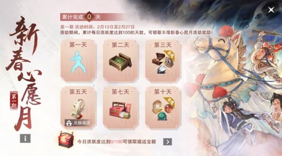 “新春心愿月”活动期间,少侠每日游玩达到100活跃度,即可领取一次限定福运礼盒,开启可随机获得大量绑元、五色石、锦芳绣·珍等多种好礼,还有机会开出武魂、千年寒铁等稀有材料!
