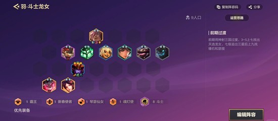 运营思路:前期连胜连败都可,连败就3-2直线拉七找出天选龙女带个羊刀就能锁血了。如果连胜那么建议是拿三国加神射过度,推荐是3-5去拉七,找出三星龙女后直线上九找出两星瑟提和两星锤石