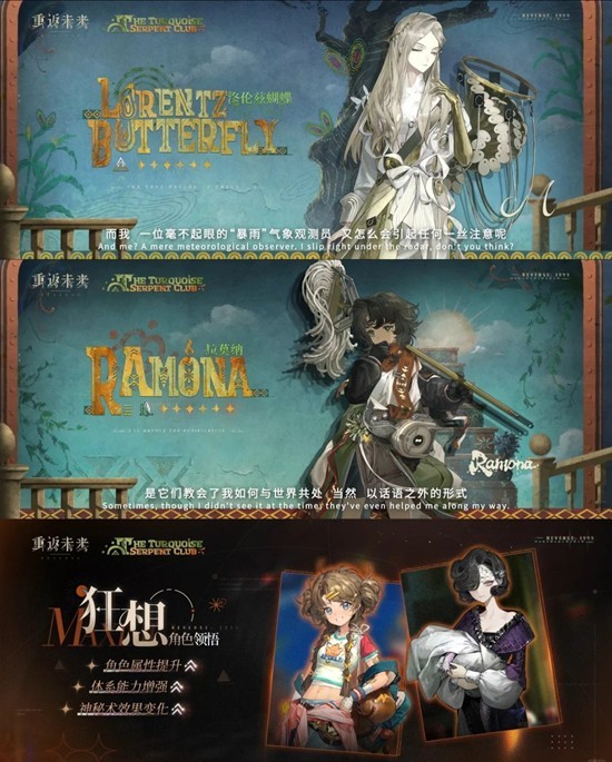 新角色:智系角色洛伦兹蝴蝶+木系角色拉莫纳,按之前的惯例,可能是之前的体系队售后。小道消息说洛伦兹蝴蝶可能是余辉队售后(不保真)