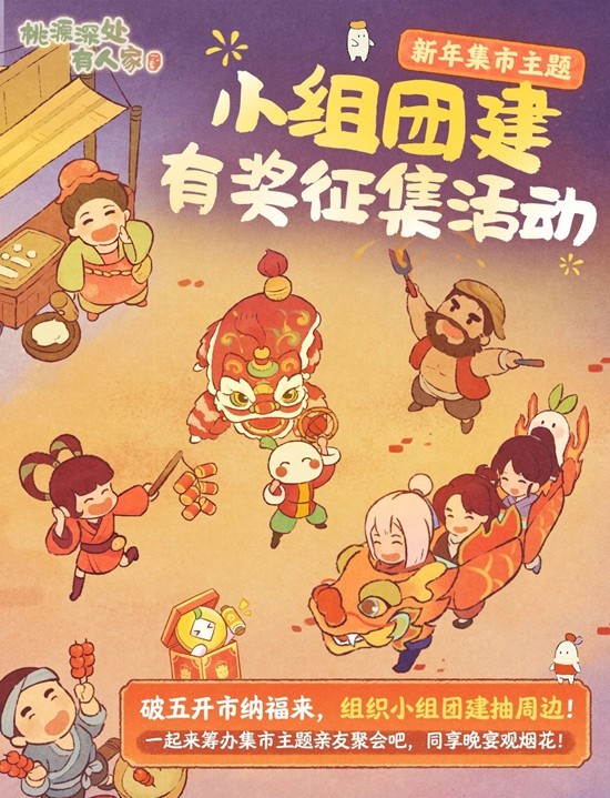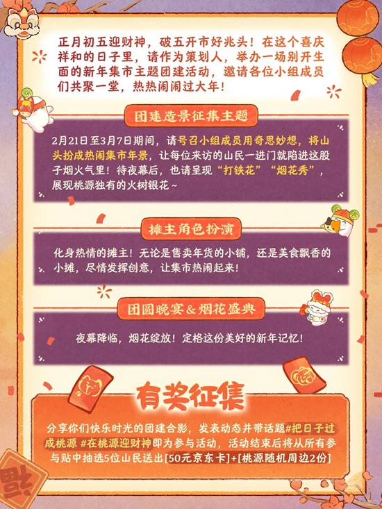 桃源深处有人家团建活动,团建造景征集主题开启~2月21日至3月7日期间,请号召小组成员用奇思妙想,将山头扮成热闹集市年景,让每位来访的山民一进门就陷进这股子烟火气里!一起来和小编看看吧~
