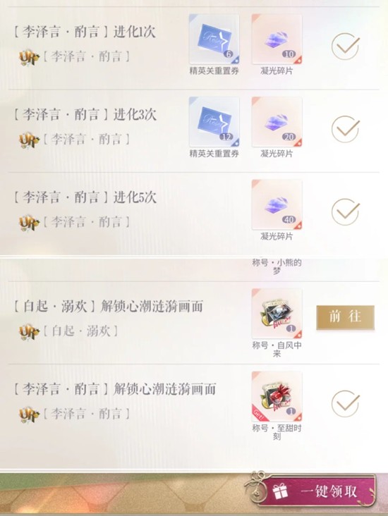 活动开始时我手上刚好只有100个凝光碎片,120多抽获得李泽言的「酌言」后,继续下池凑够144抽,又换了一张,分解获得100个凝光碎片,加上返还,刚刚好够我进化5次,解锁心潮涟漪画面,获得称号。