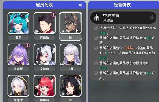 店铺购入后,合理配置员工是提升经营效率的关键。异环中的每位角色都拥有独特的技能,例如调制饮品、烘焙糕点等。安排员工时,务必根据其技能进行岗位分配,让擅长调酒的角色负责吧台,精通烘焙的角色管理甜品区。正确的人事安排能最大化店铺的运营效率,从而增加方斯收入。如果岗位安排错误,会导致人力浪费,收入大打折扣。