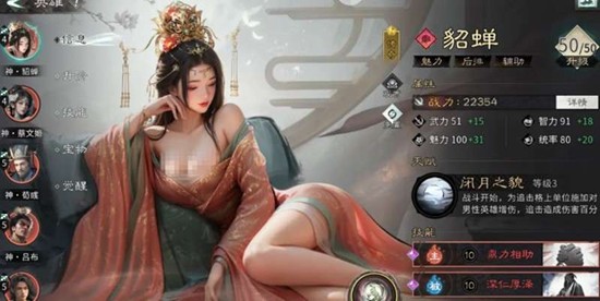 在阵容搭配方面,貂蝉主要有两个主流选择。其一是“凤仪亭”队,由貂蝉、吕布和董卓组成,在这个阵容中,貂蝉能进一步强化吕布的输出能力。其二是“红颜协同”队,这是一个以女性武将为核心的队伍,貂蝉与黄月英等武将配合,能显著增强全队的整体输出。