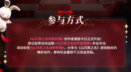 "兔子并不逃跑,它只是站在舞台中央,任由目光、灯火、命运,一层一层落下。你我并非被操控的无辜者,而是清醒地走进戏里。"《以闪亮之名》全新版本「戏梦织偶」主题创作者激励活动今日正式开启!分享你的精彩创作,即有机会赢取千元现金奖励。