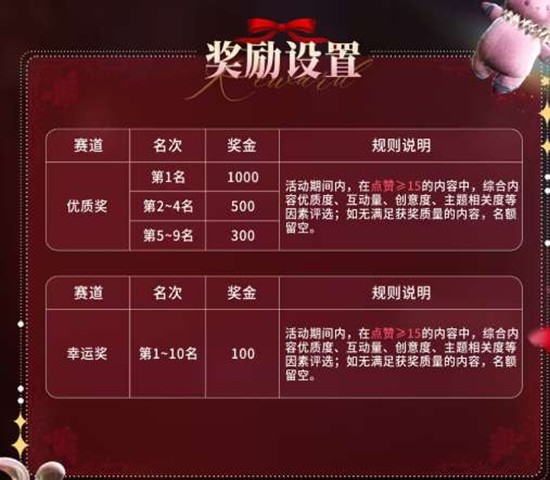 本次活动设优质奖与幸运奖两大赛道,只要在点赞≥15的内容中综合内容质量、互动量、创意度等维度评选。