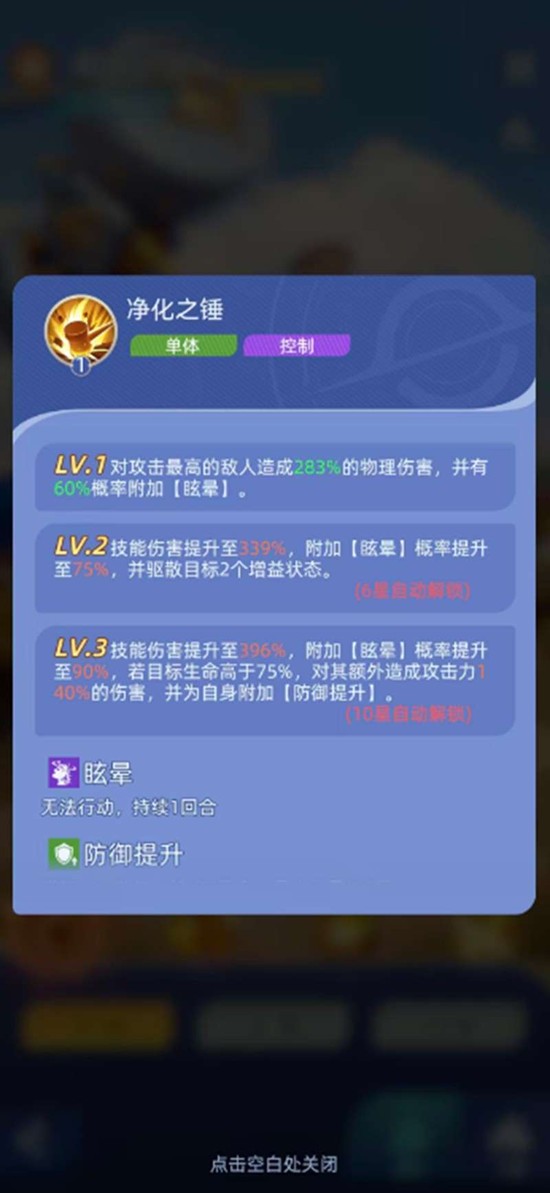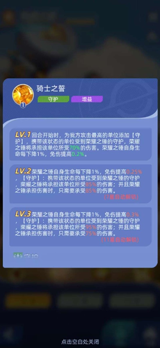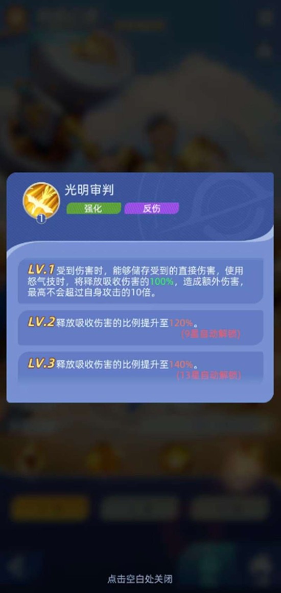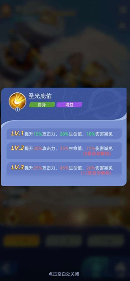 “圣光庇佑”是瓦尔德迪欧的被动增益技能。初始效果可提升他15%的攻击力、20%的生命值以及10%的伤害减免。通过将角色升星至12星解锁技能第三级后,这些加成都将获得显著提升:攻击力加成变为25%,生命值加成高达45%,伤害减免也提升至20%。这个技能大幅强化了他的生存与辅助能力,是支撑其前排职责的重要基础。