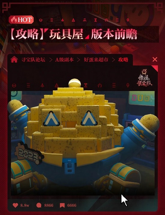 蛋仔派对惊魂寻宝队「玩具屋」版本3月6日开启~全新副本区域“玩具区”,怪物“熊兔气球”以及宝物“eggy游戏机”、“飞船模型”、“玩具卡车”上线,一起重温那场停在春天的梦。一起来和小编看看吧~