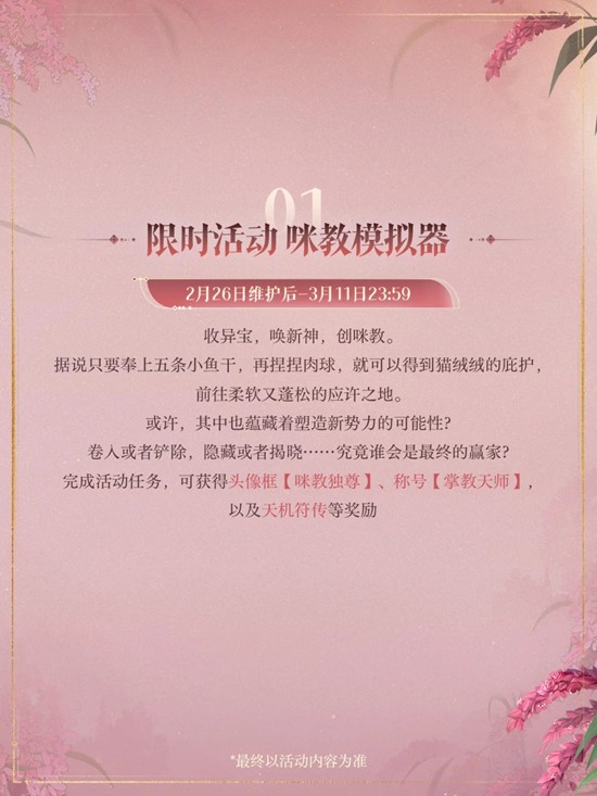 活动奖励:完成活动任务,可获得头像框【掌教天师】、称号【咪教独尊】,以及天机符传等奖励