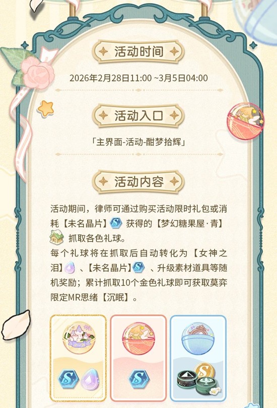未定事件簿「酣梦拾辉」活动2月28日限时复刻~活动期间,律师可通过购买活动限时礼包或消耗【未名晶片】获得的【梦幻糖果屋·青】抓取各色礼球。累计抓取10个金色礼球即可获取莫弈限定MR思绪【沉眠】,一起来和小编看看吧~
