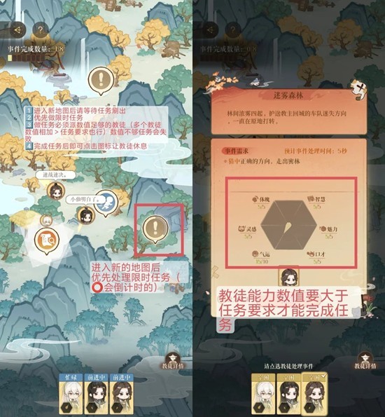 做任务必须派数值足够的教徒(多个教徒数值相加>任务要求也行)数值不够任务会失败