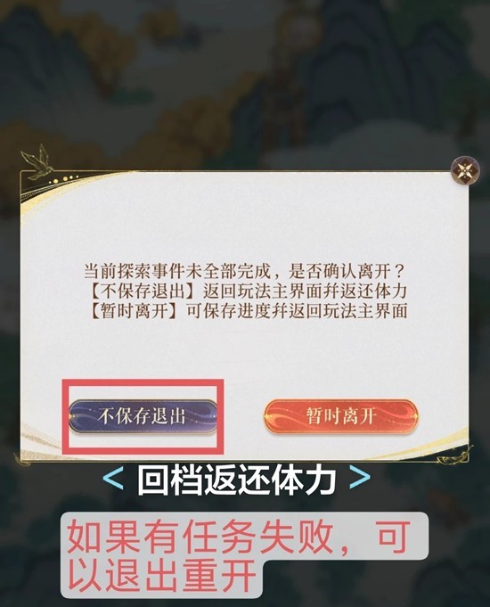 如果任务数量完成的不够,可以点左上角退出回档,体力会返还