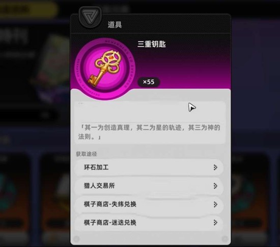 目前,异环为玩家提供了多个获取三重钥匙的渠道。其一是使用环石进行加工兑换,每160个环石可以换取一把三重钥匙。环石作为异环中的高级货币,多数玩家会优先用于抽取限定角色,用其兑换钥匙的性价比较低,资源有限的玩家通常不考虑此途径。