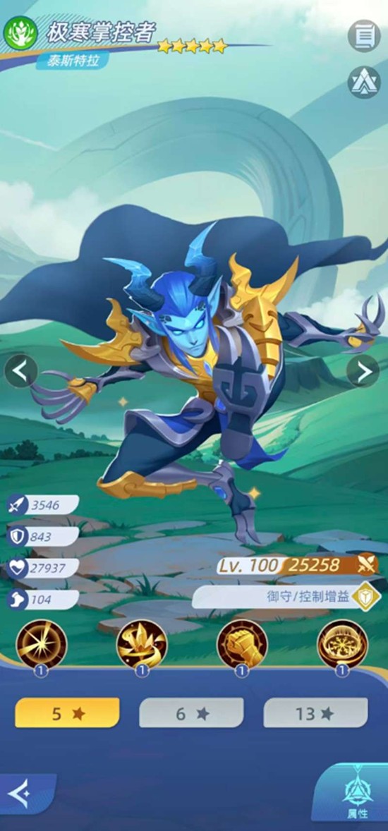 他的另一个特色技能寒冰壁垒则带有反击与减益效果。每次受到攻击时,有概率对攻击者附加伤害降低的减益状态,并可叠加层数。在更高星级下,该技能还会额外附加可叠加的速度降低效果,能有效干扰敌方核心单位的行动节奏,在神召大陆的持久战中能发挥出强大的战略压制作用。