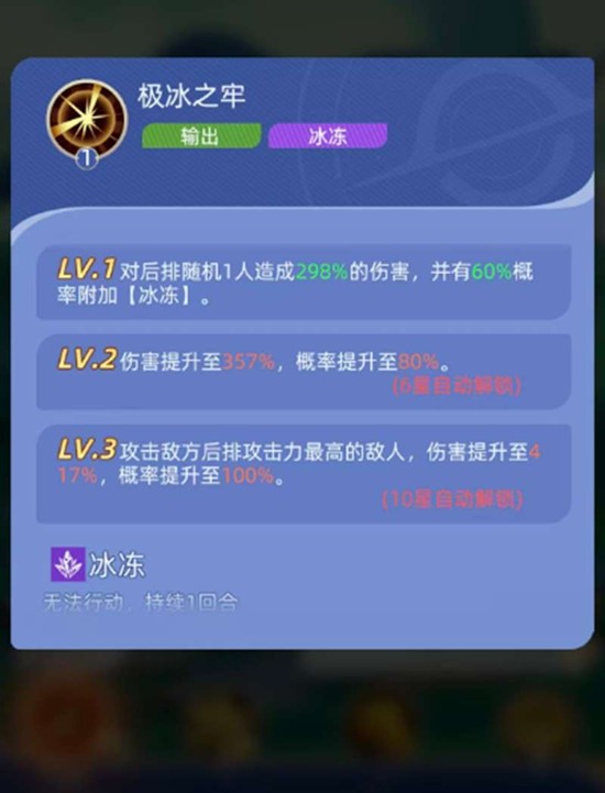 泰斯特拉的核心控制技能是极冰之牢,它能对敌方后排随机目标造成高额伤害,并有概率附加冰冻效果,使目标无法行动一回合。随着角色升星,该技能的伤害与冰冻概率会显著提升,在达到10星时,更是能精准攻击后排攻击力最高的敌人,并确保100%的概率施加冰冻,这让他成为了神召大陆冰冻队中可靠的控制核心。